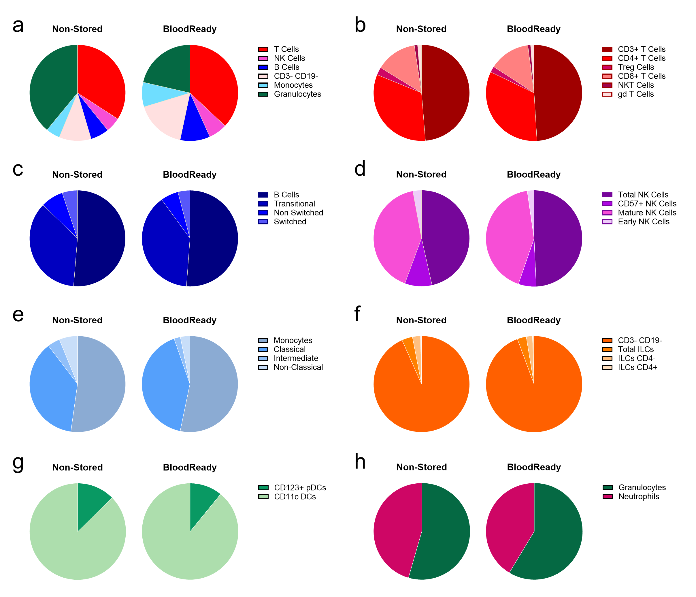 Comprehensive immunophenotyping shows that BloodReady preserves the cell viability of major and rare immune cell populations in whole blood including: T Cells (CD3+), Helper T cells (CD4+), Cytotoxic T cells (CD8+), Regulatory T cells (CD25+ CD127-/dim), Gamma delta T cells (TCRγδ+), and Natural Killer T cells (CD56+). NK Cells (CD56+ CD16+), CD57+ NK cells, Early NK cells (CD56+ CD16-), and Mature NK cells (CD56+ CD16+). B Cells (CD19+), Transitional B cells (CD27- IgD+), Non-Switched B Cells (CD27+ IgD+), and Switched B cells (CD27+ IgD-). Innate Lymphoid Cells (ILC) (CD127+), ILCs CD2+ CD4+, and ILCs CD2+ CD4-. Monocytes (CD4+ HLA-DR-), Classical Monocytes (CD14+ CD16-), Intermediate Monocytes (CD14+ CD16+), and Non-Classical Monocytes (CD14- CD16+). Granulocytes (SSChi, CD15+ CD11b+ cells).