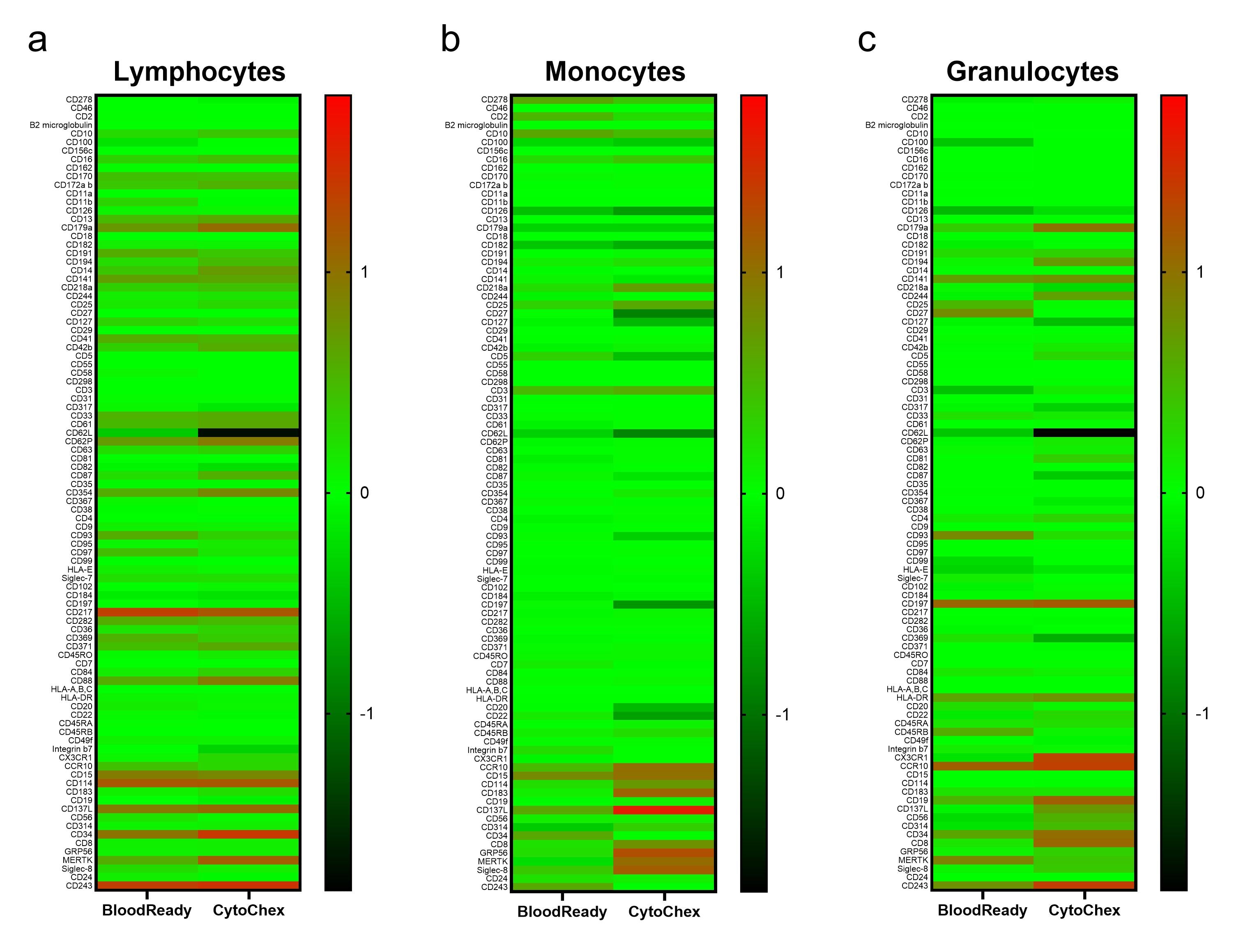 BloodReadyTM preserves the expression of >90% epitopes screened on lymphocytes, >80% on monocytes and >70% on granulocytes. Comparison with major competitor fixative solution Cyto-Chex shows that BloodReadyTM preferably preserves several epitopes including CD62L, CD317, CD82, CD367, and integrin b7, while also not limiting downstream application due to fixation.